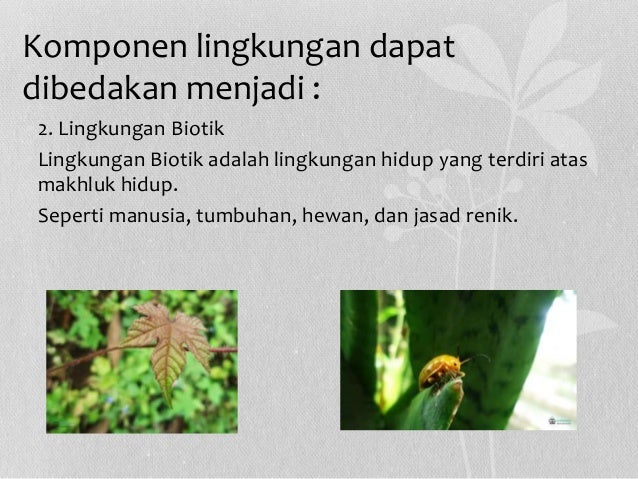 12 1 2014 Lingkungan pada alam mencakup semua benda hidup dan tak hidup yang terjadi secara alamiah di bumi Lingkungan dari alam berbeda dengan lingkungan buatan yang terdiri atas area dan komponen alam yang telah dipengaruhi manusia Lingkungan di alam dapat berbentuk sungai danau laut gunung rawa hutan dan lain lain